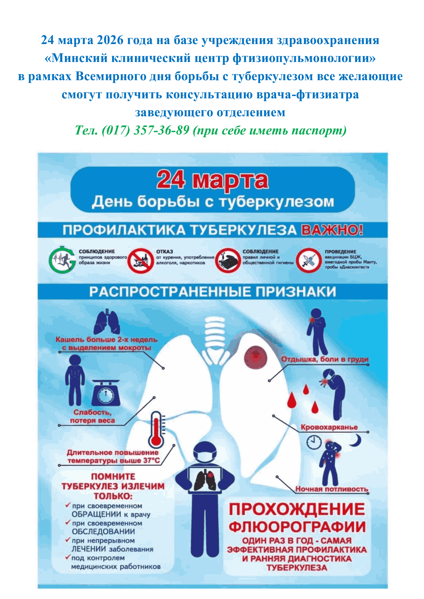 - 24 марта 2026 года на базе учреждения здравоохранения «Минский клинический центр фтизиопульмонологии» все желающие могут получить консультацию врача-фтизиатра заведующего отделением (информационный материал прилагается);